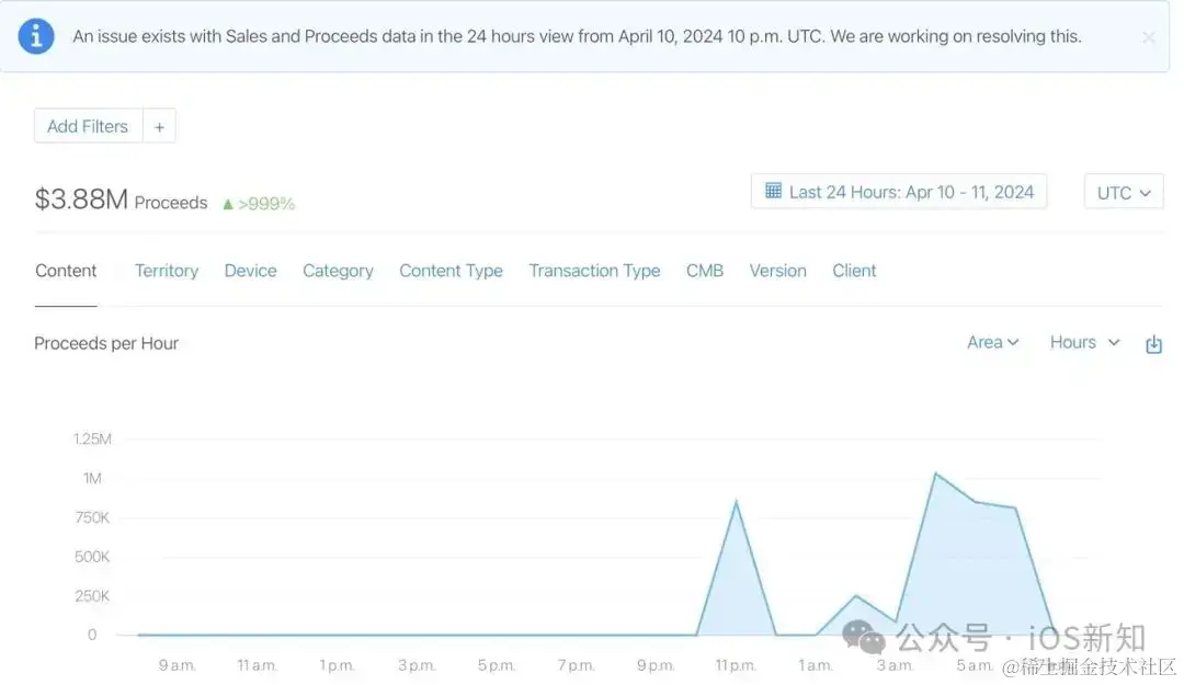 苹果很快发现了问题,然后发布了公告:UTC 时间 2024 年 4 月 10 日晚上 10 点的 24 小时视图中的销售和收益数据存在问题。我们正在努力解决这个问题,随后苹果修复了这部分数据。