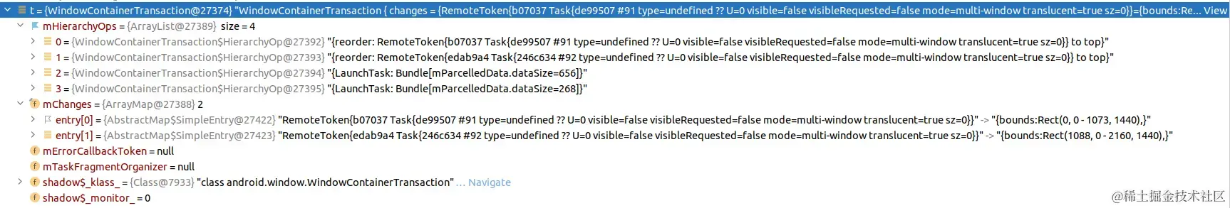 这里还是运用了WindowOrganizer框架的能力,把所有修改点封装到 WindowContainerTransaction中,然后通过mTaskOrganizer.applyTransaction(wct); 转交给Framework,Framework解析WindowContainerTransaction,然后执行对应的变化 我们可以看看WindowContainerTransaction的内容