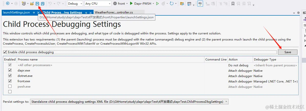 安装插件后启动 Visual Studio,可以在 Debug -> Other Debugging Targets 中找到 Child Process Debugging Settings。