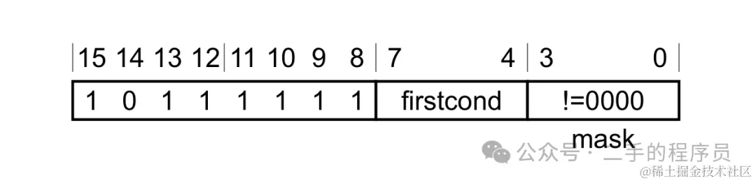 所以,我们发现,最后一位一直是1,它表示IT后跟着的第一条指令的条件永远是正,即与 IT 保持一致,后面的几条指令,需要根据对应的bit位来决定条件是正还是反。