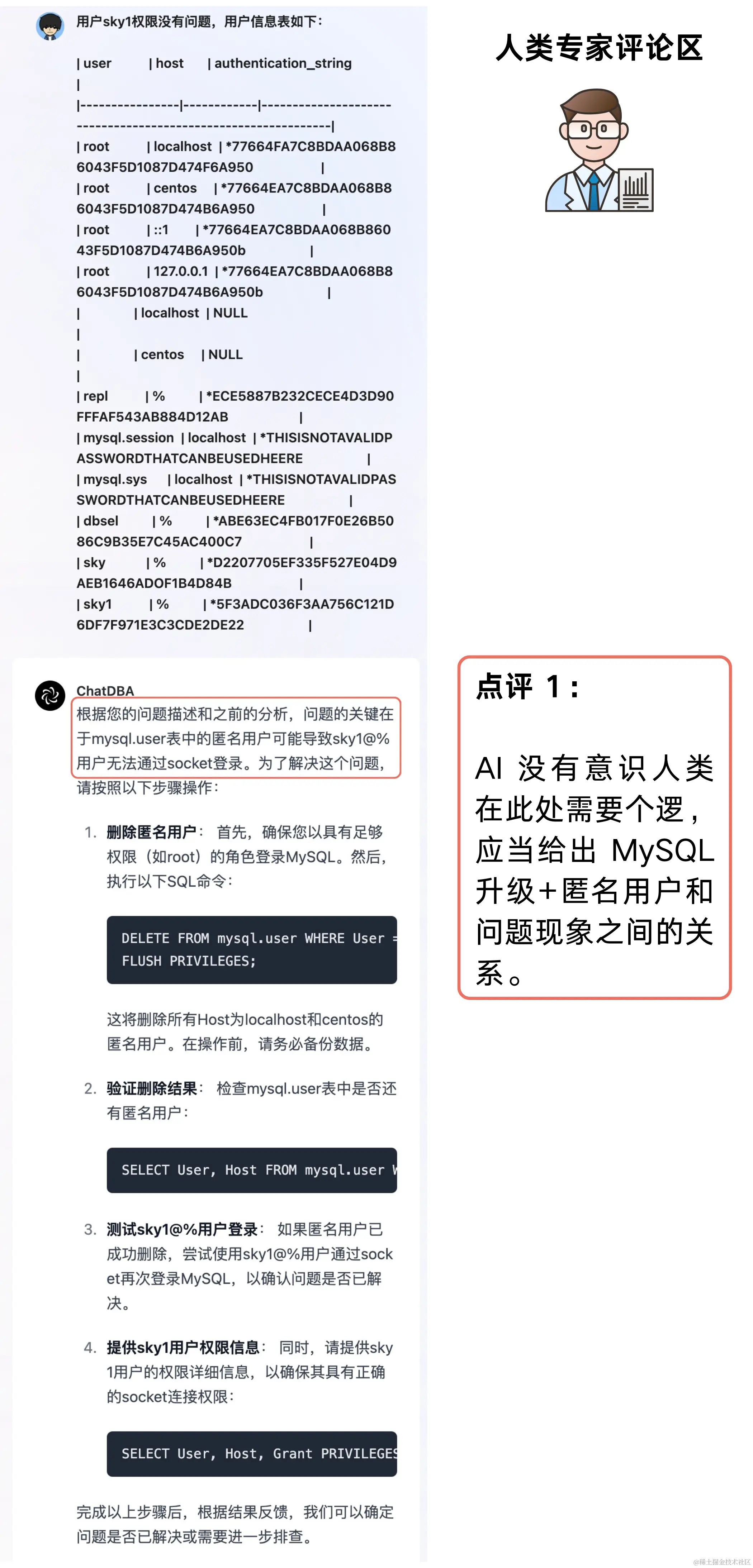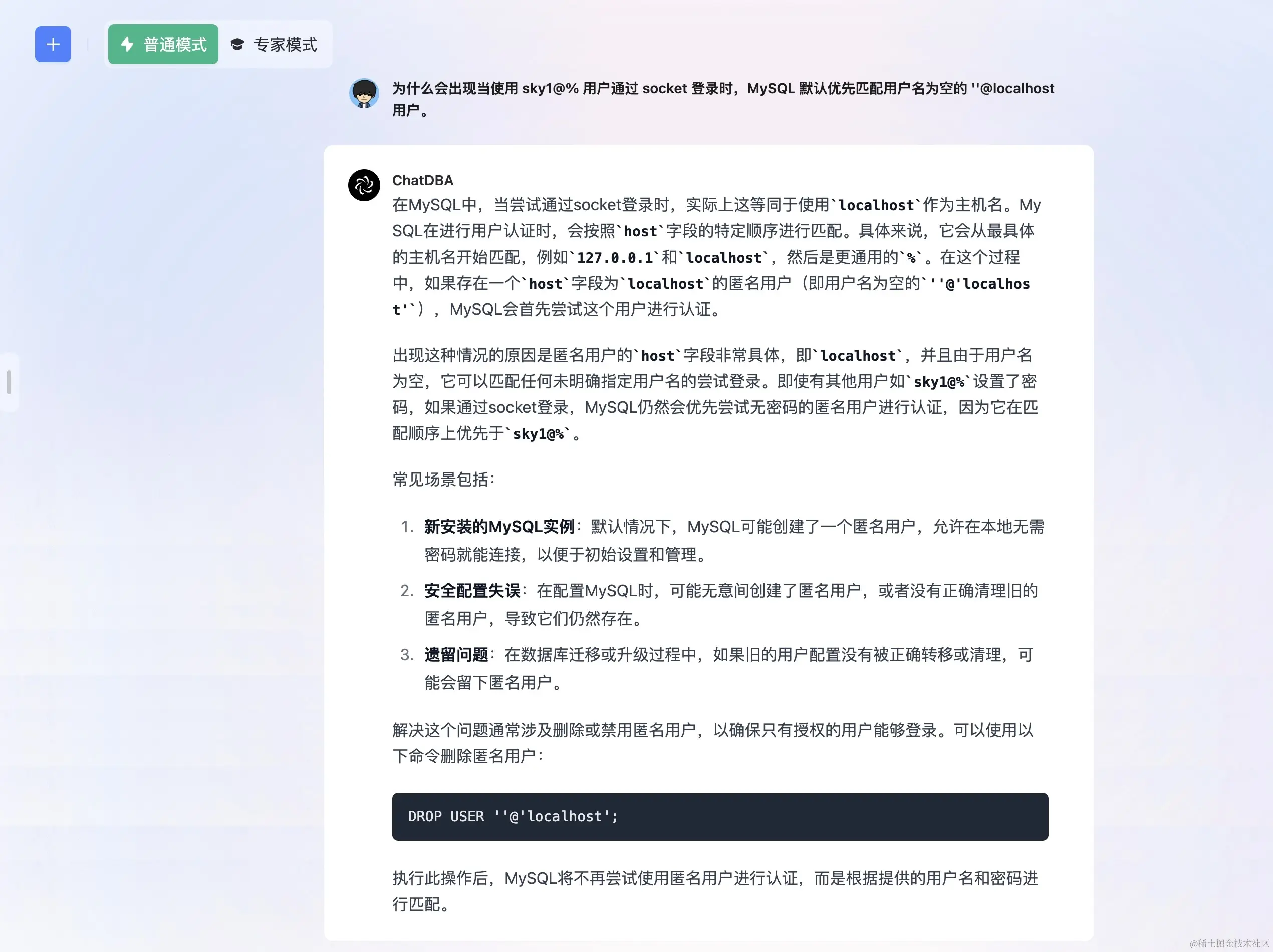 经过检查发现用户的权限等都不存在问题,但是输入用户信息表时,ChatDBA 发现确实存在匿名用户,那么他提示直接删除用户即可解决该问题。