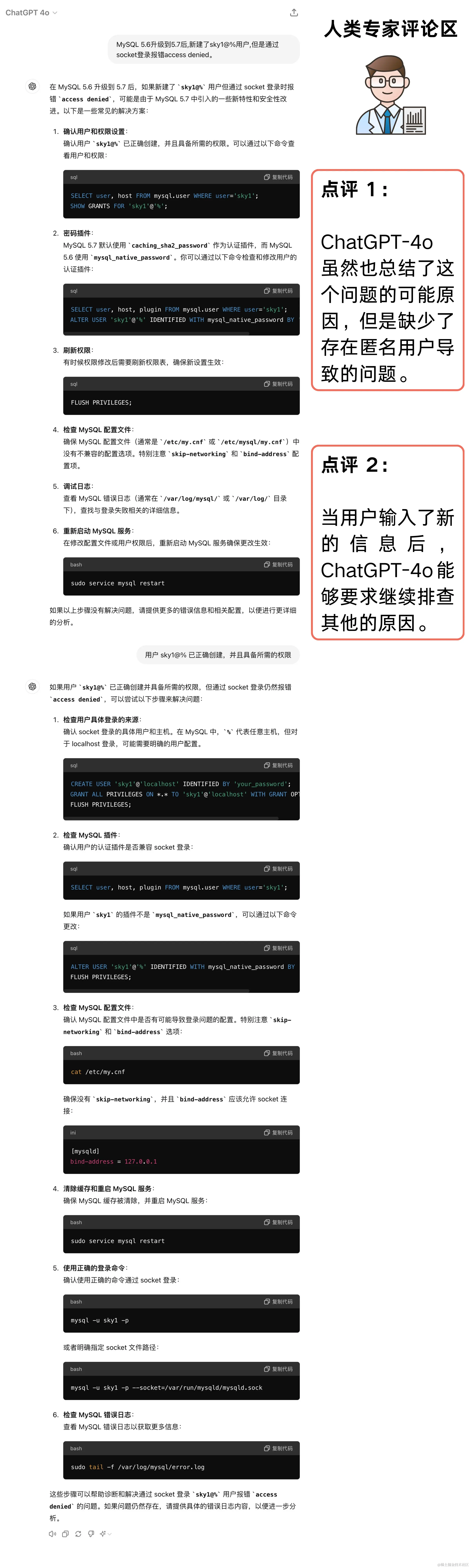 但是其实在 MySQL 5.7 中优化了用户匹配规则。当使用 socket 链接时,不会优先匹配到匿名用户,因此全新安装的 MySQL 5.7 不会出现这个问题。而从 5.6 升级到 5.7 的过程中,MySQL 对用户表元数据没有更新,所以导致了用户开头出现的当从 MySQL 5.6 升级到 5.7 后,新建了一个 sky1@% 的用户,但是通过 socket 登录报错 Access denied。