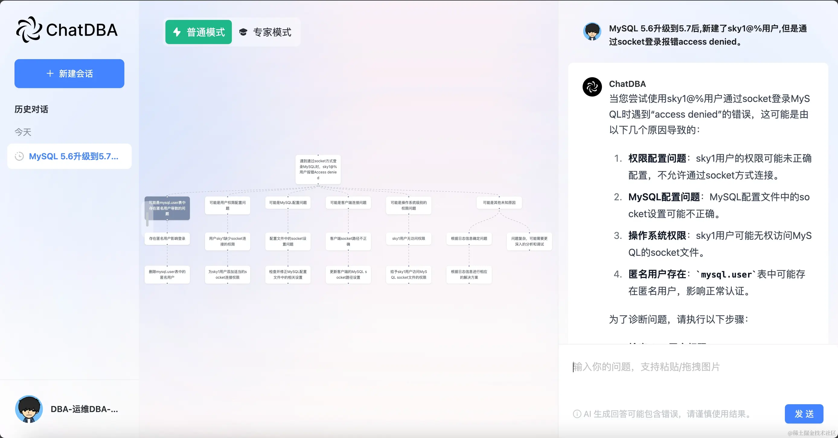 左侧为流程分析画布,展示 ChatDBA 对此问题的排查逻辑;右侧为互动区域