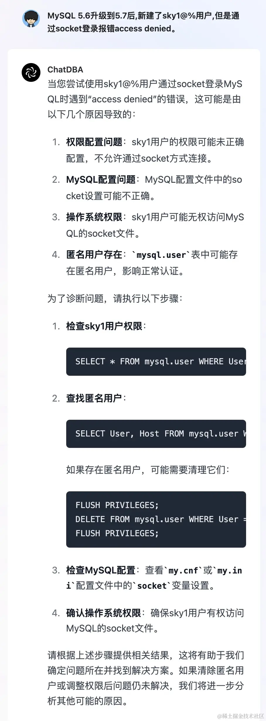 这个问题是说用户虽然创建了名字为 sky1 的用户,但是却登录不上去,这时 ChatDBA 给出的可能原因有: