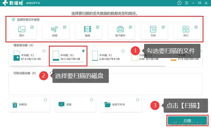 步骤1:下载并安装数据恢复软件,打开软件后,选择需要找回的文件类型和文件位置,点击【扫描】;