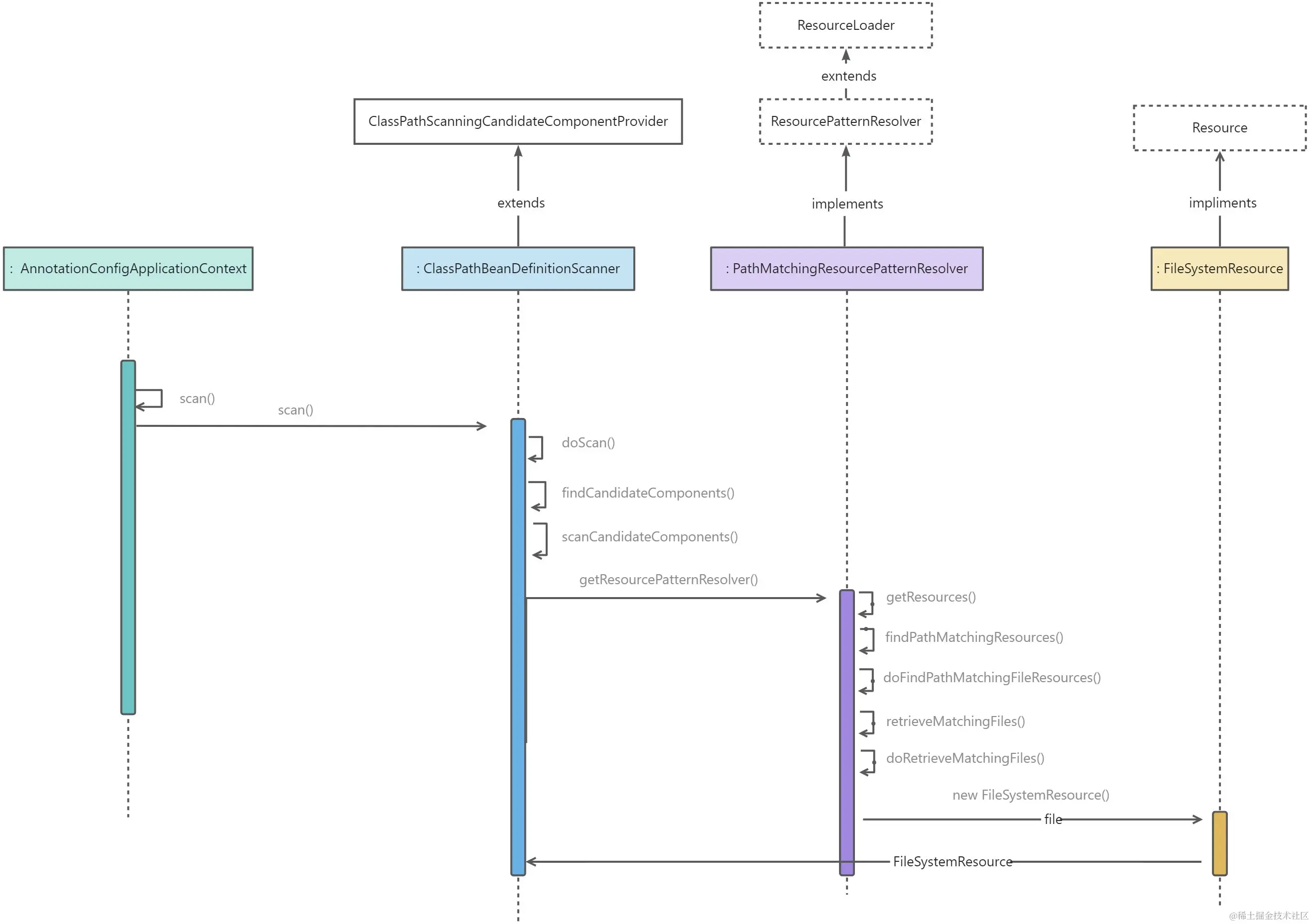 - 调用scanCandidateComponents(),在方法内部先调用getResourcePatternResolver()的到: PathMatchingResourcePatternResolver对象,他是ResourceLoader的实现类。