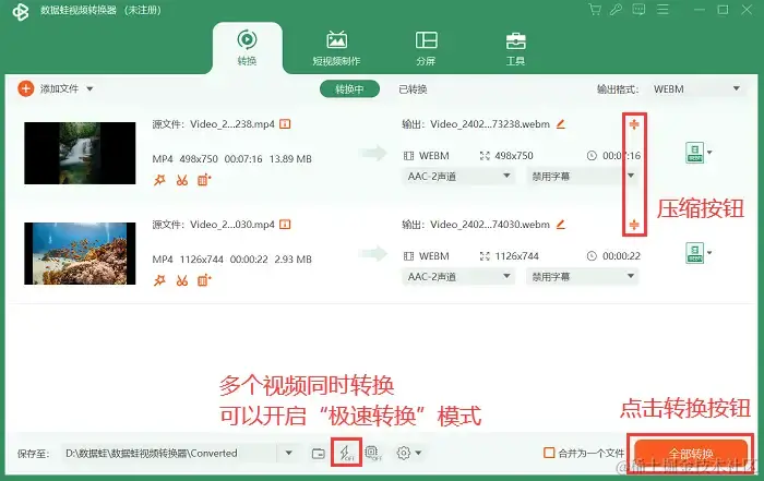 步骤3:视频如果太大,可以对它们进行大小的压缩。而且多个视频同时转换,也可以开启**【极速转换】**模式来加快格式的转换速度。