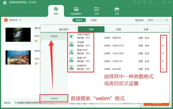 步骤2:点击**【输出格式】右侧的倒三角,在【视频】窗口直接搜索【webm】**格式,并选中该格式。接着选择其中一种参数格式,或者自定义设置格式参数,以满足不同的需求。