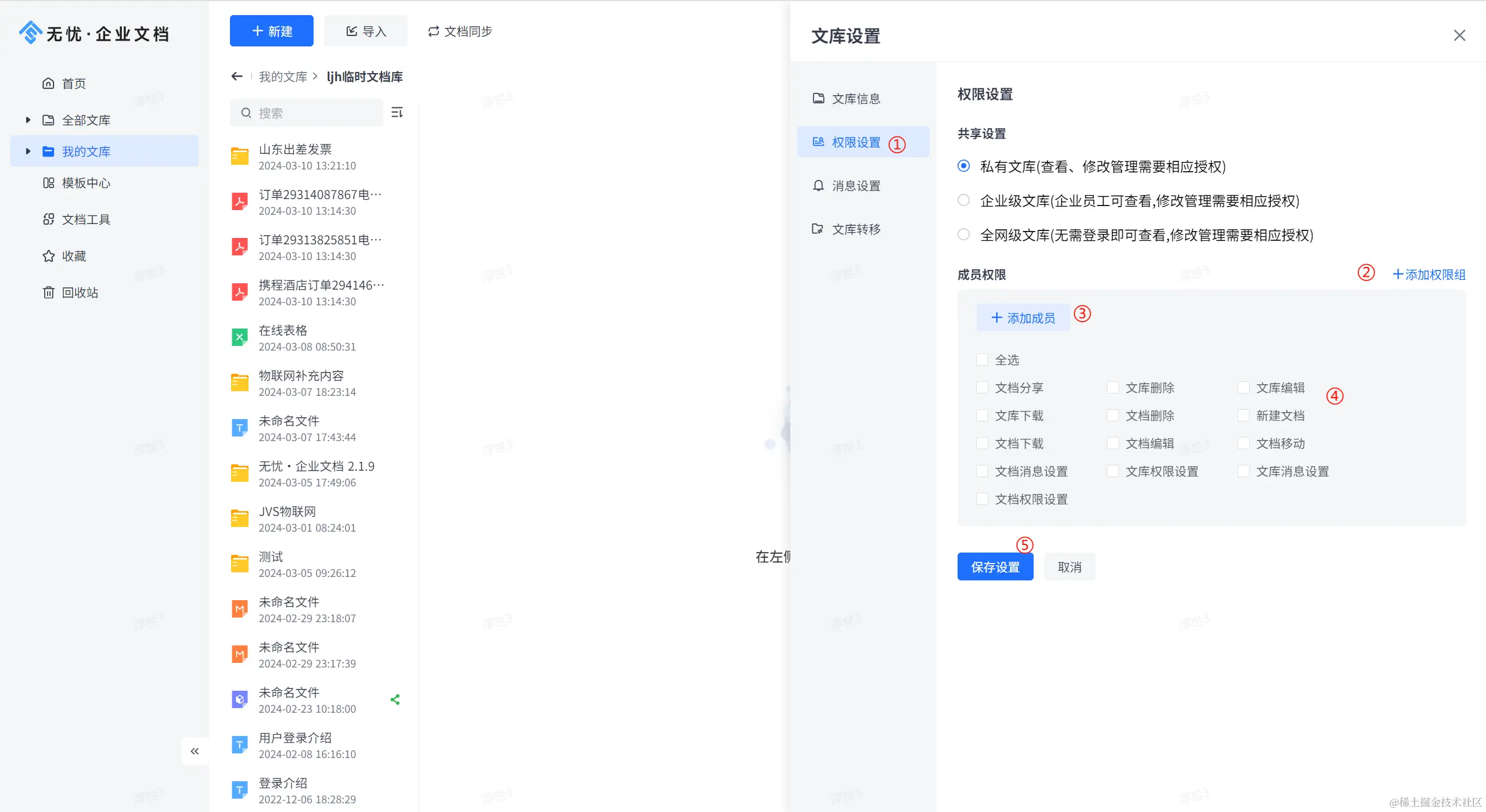 ①:文库的权限设置界面