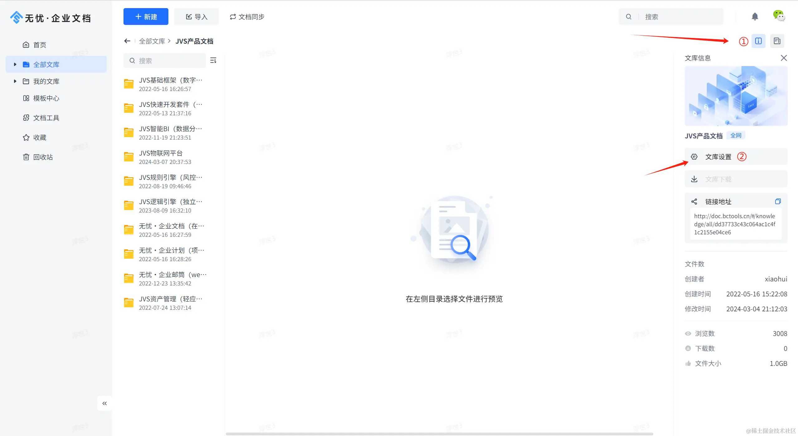 也可从文库的信息按钮点击进入①,选择文库设置按钮②,进入