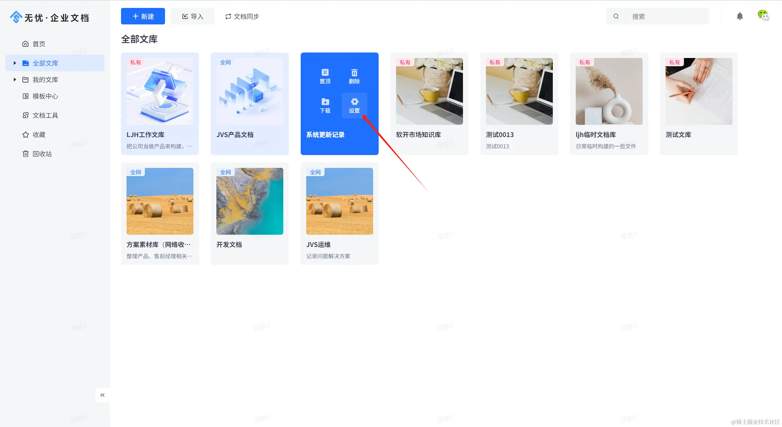 文库的权限配置入口,可从文库的设置进入: