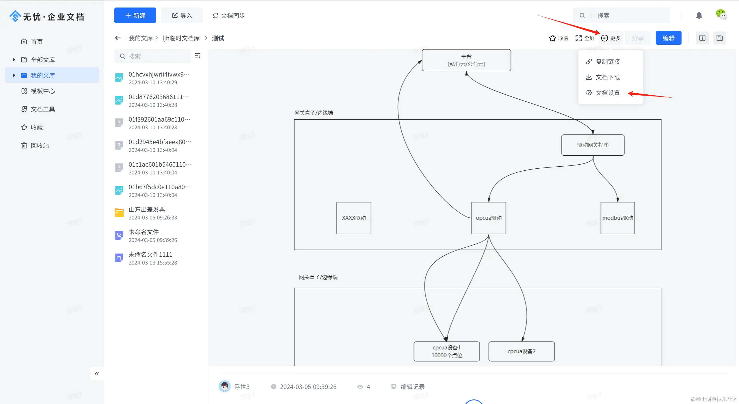 在文档的预览界面,点击“更多”按钮,在下拉菜单中找到文档设置选项,点击文档设置,如下图所示:
