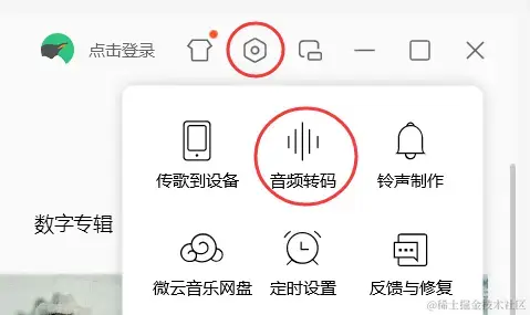 第1步:打开音乐播放软件界面,在**【设置】中点击【音频转码】**功能。
