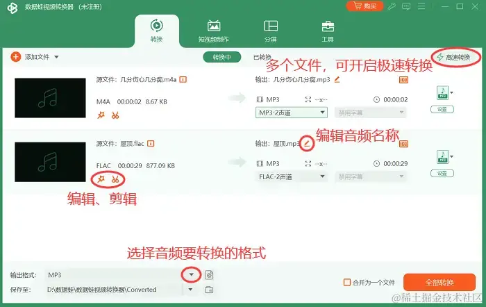 第3步:转换前,可以对音频文件进行编辑、剪辑、修改名称等设置。如果需要转换的音频文件过多,可以开启**【极速转换】**模式,加快音频格式转换速度。