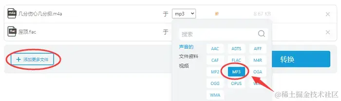 第2步:再选择**【目标格式】,点击【转换】按钮后,稍等片刻即可完成转换。如果想要批量上传文件,可以点击【添加更多文件】**。