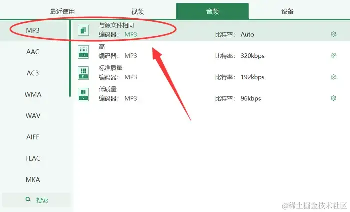 第4步:在**【输出格式】**窗口中,选择要转换的音频格式,比如把音频转换成mp3格式。