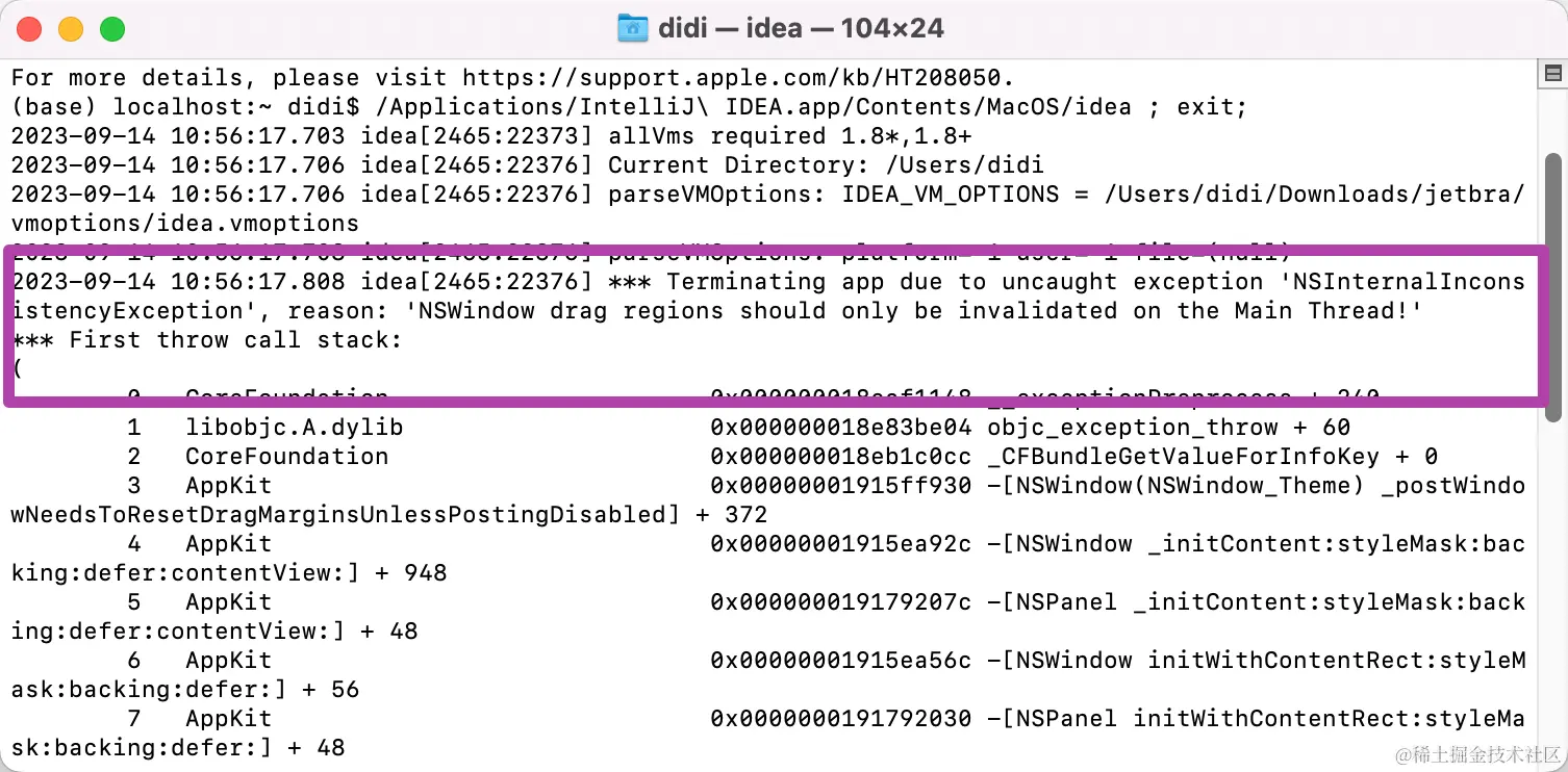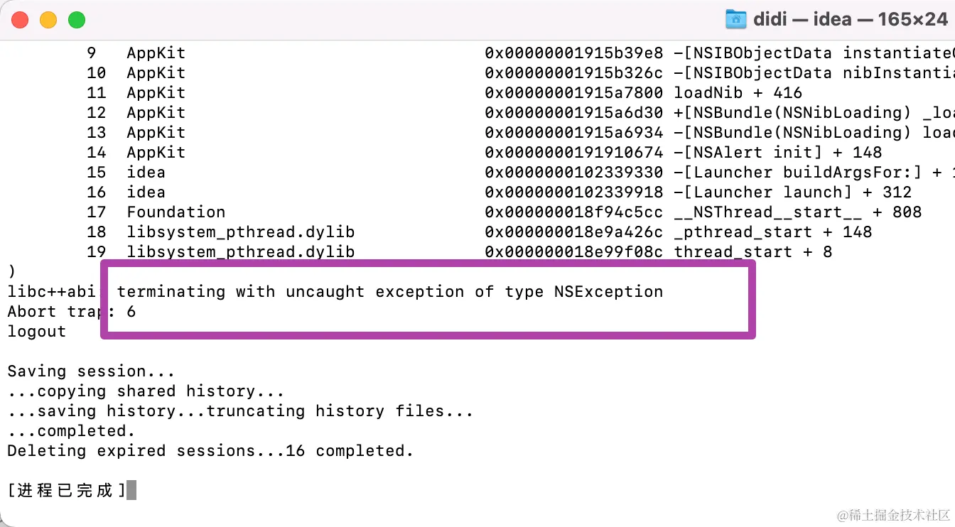 此时,只要打开这一终端,就可以看到我们最近一次打开IntelliJ IDEA软件时的日志,也就是我们刚刚打开软件失败的错误日志;如下图所示。