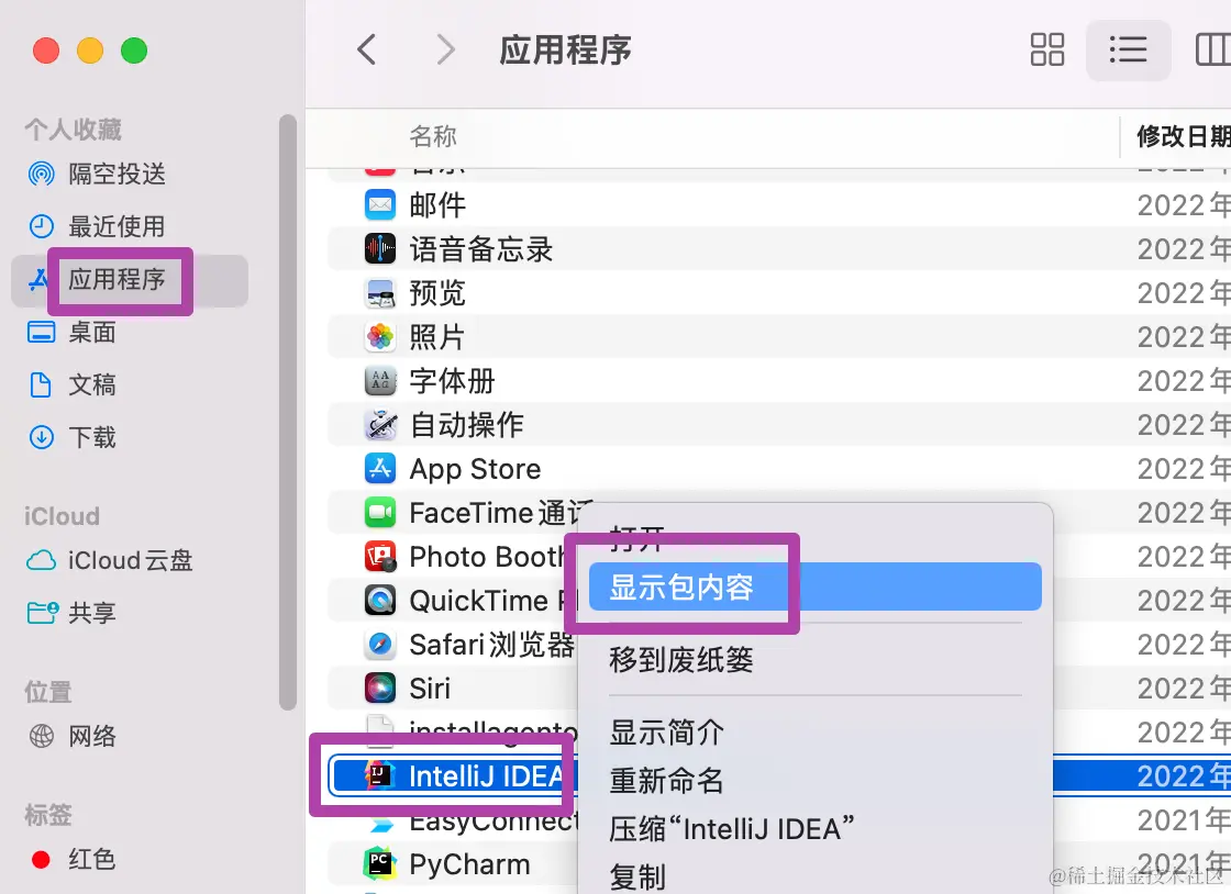 首先,我们打开访达,并选择“应用程序”;接下来,找到IntelliJ IDEA软件,并右键选择“显示包内容”;如下图所示。