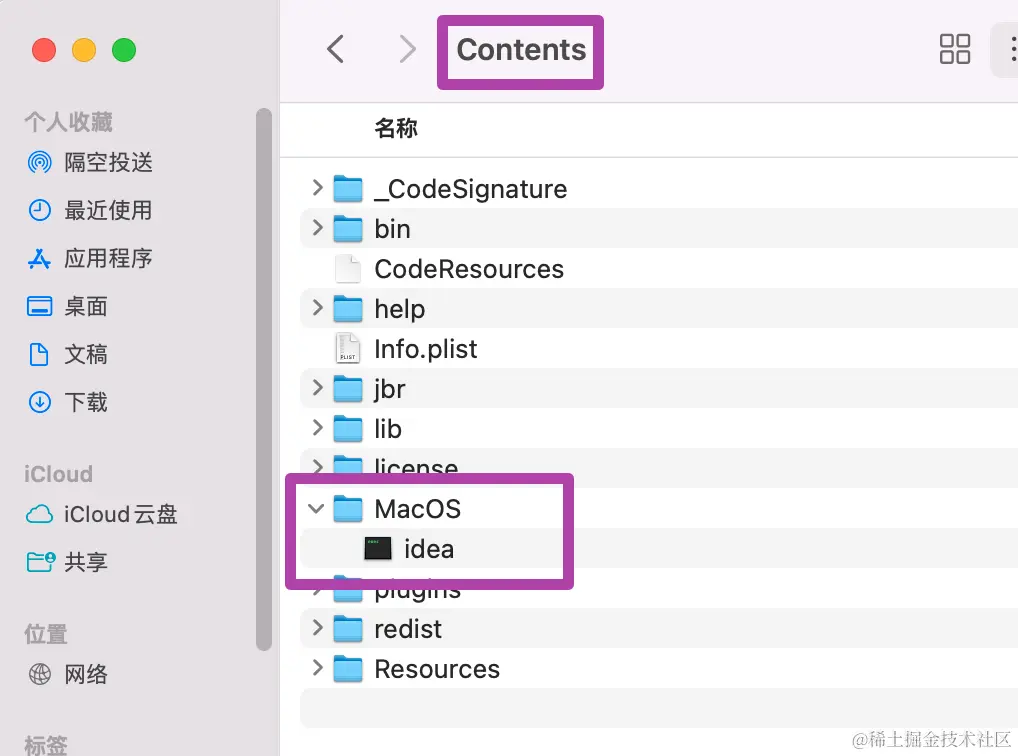 接下来,打开Contents文件夹,随后打开MacOS文件夹,并选择下面的“idea”终端;如下图所示。