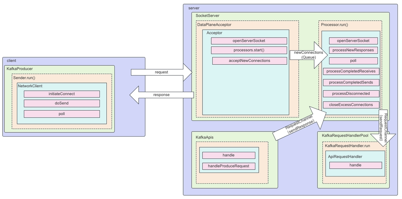 图上就是一个从发送消息到收到响应主要经过的流程。Client:1.KafkaProducer 初始化 Sender 线程2.Sender 线程从 RecordAccumulator 中获取攒批好的数据(这里详细的客户端发送可以看 mp.weixin.qq.com/s/J2\_O1l81… 线程调用 NetworkClient 检查连接(未 ready 需要 initiateConnect)4.Sender 线程调用 NetworkClient 的 doSend 方法将数据写入 KafkaChannel5.Sender 线程调用 NetworkClient 的 poll 进行实际的发送Server:1.KafkaServer 初始化 SocketServer、dataPlaneRequestProcessor(KafkaApis)、dataPlaneRequestHandlerPool2.SocketServer 初始化 RequestChannel、dataPlaneAcceptor3.dataPlaneAcceptor 负责获取连接并分配处理任务给对应的 Processor4.Processor 线程从 newConnections 的 queue 中取出任务进行处理5.Processor 线程处理准备好的 IO 事件
