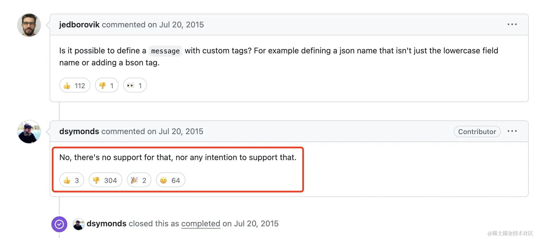 具体 golang/protobuf 不支持的原因,其项目成员在社区的多年争斗下,给出了相对明确的答复。