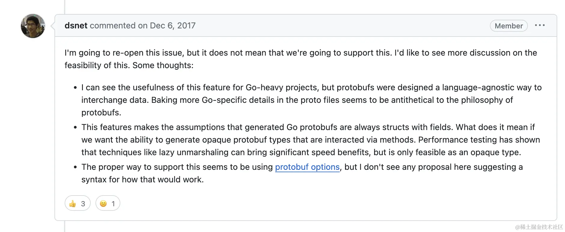 官方 golang/protobuf 固然有自己的原则,社区也有自己的需求。开源的项目过大了,长年累月下来会难维护。