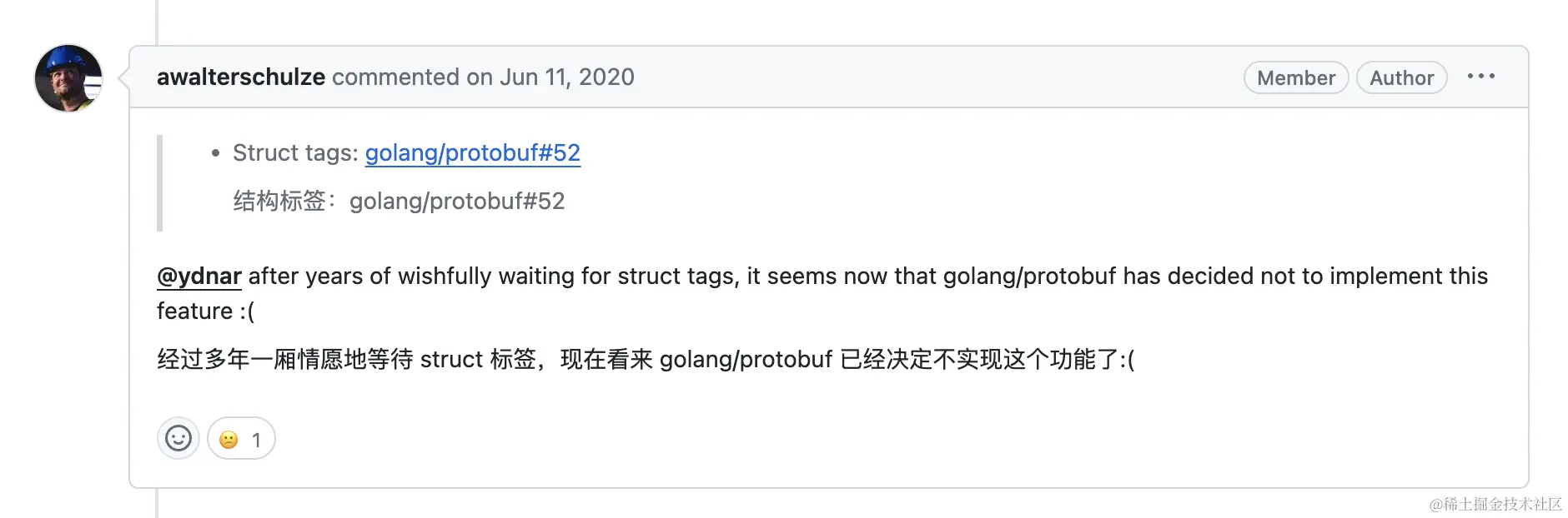 其作者在最终对官方 protobuf 库最绝望的一个事情,莫过于他朝朝暮暮,但官方一直不愿支持的标签注入功能。这也是很多人使用 gogo/protobuf 的原因。