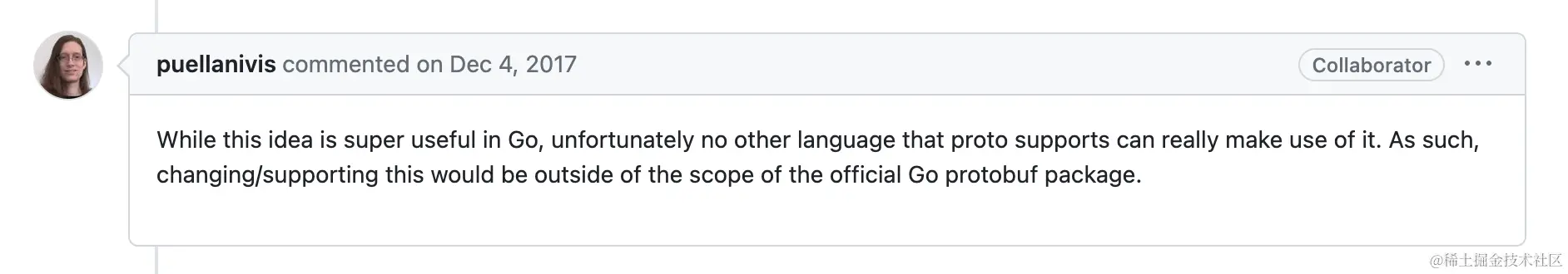 - 如果调整或支持此功能,均超出了 golang/protobuf 包的适用范围。因为官方包的定义是不与某一门编程语言强相关。