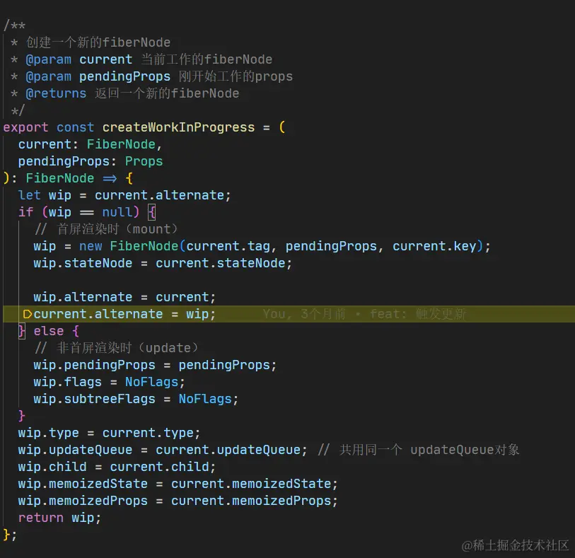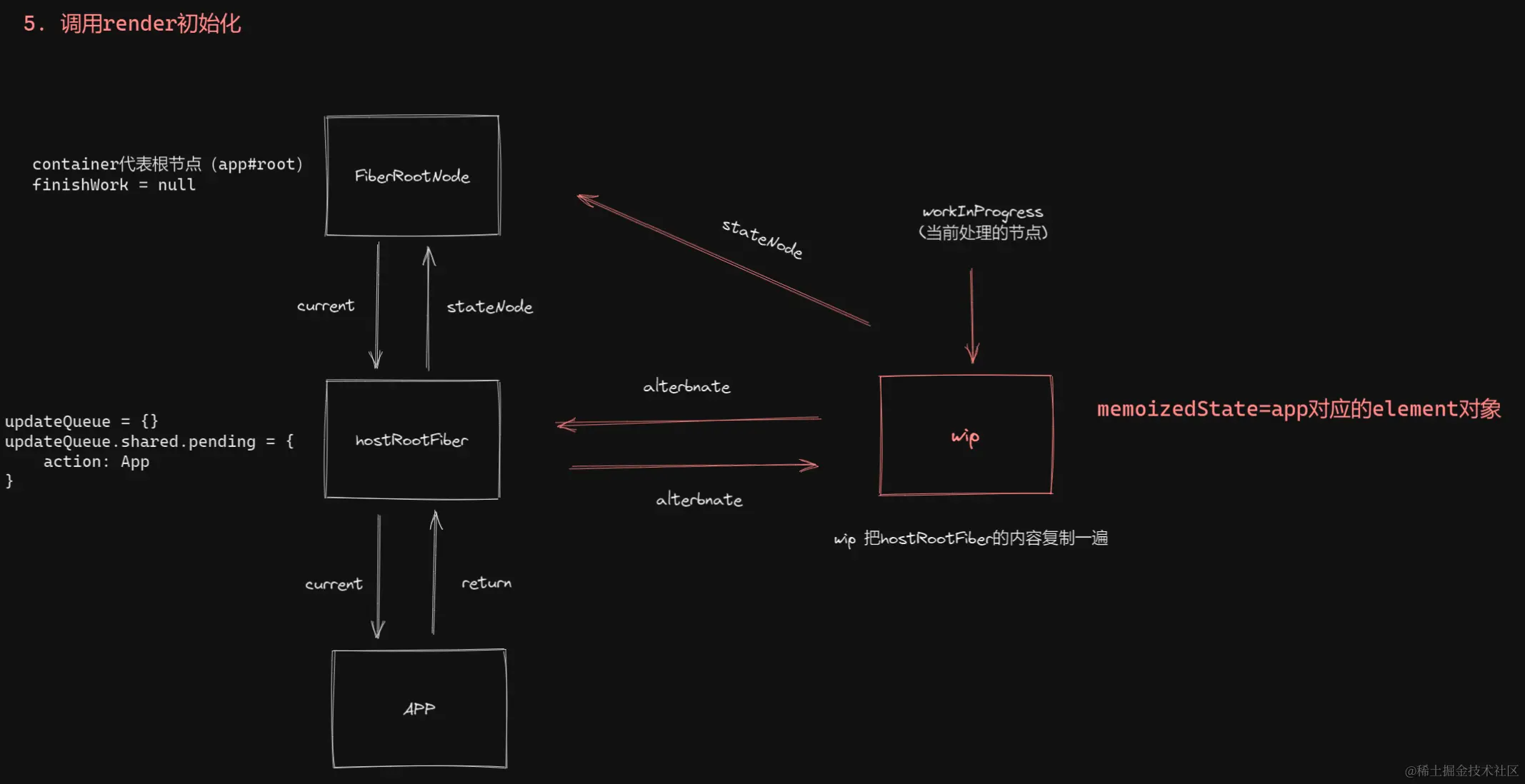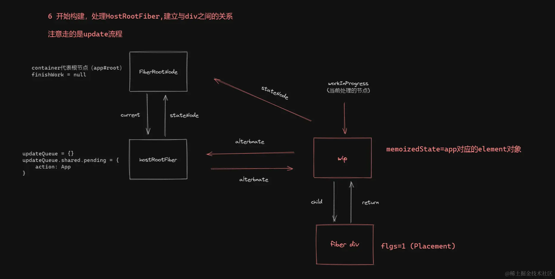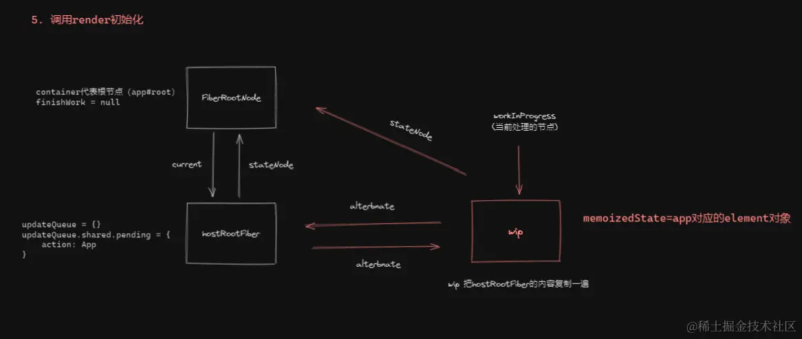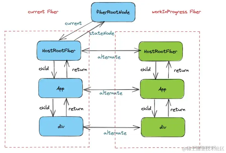 第一挂载的时候 wip 是复制的了一份 hostRootFiber 会有属性altertnate 属性 左边是旧的节点,右边是新的节点。所以说这类似一个新节点替换旧节点是一个更新过程