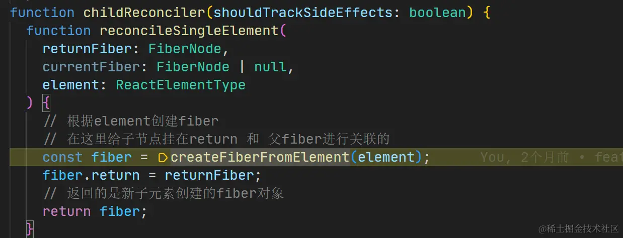 一进来会进入reconcileSingleElement这个函数,根据element创建fiber,然后给子节点挂在return 和 父fiber进行关联的最后返回的是新子元素创建的fiber对象。