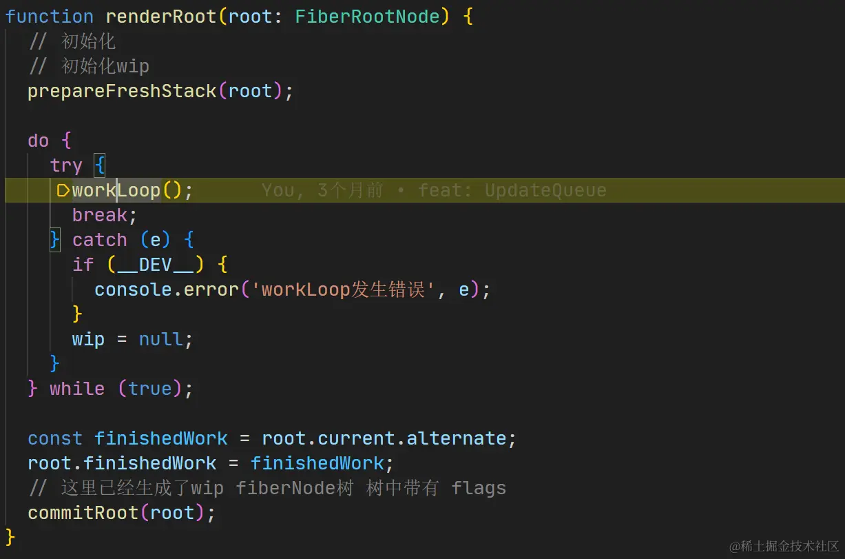 我们接着调试,当创建好上面的一个FiberRootNode 与 hostRootFiber 链接关系后,就回去运行render方法