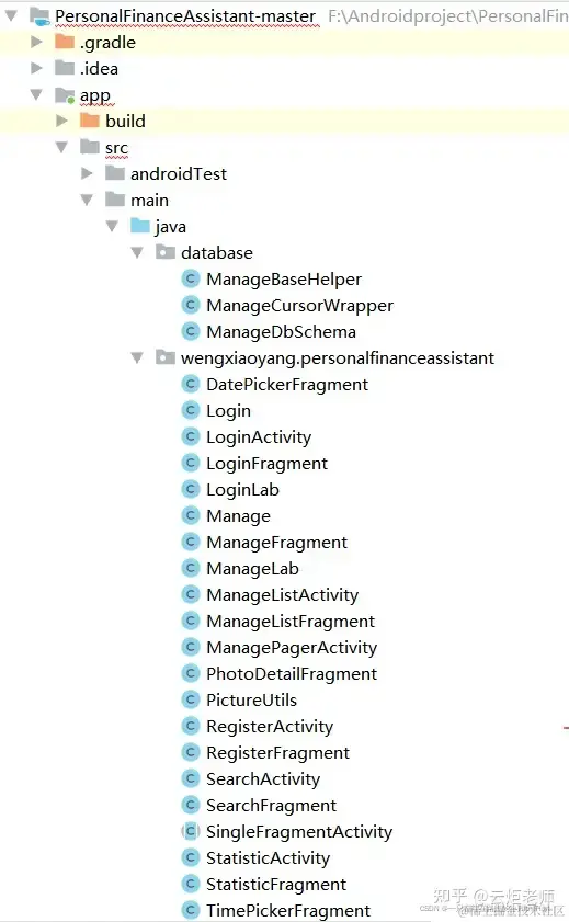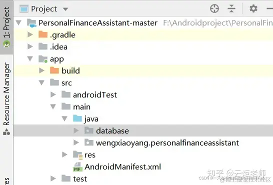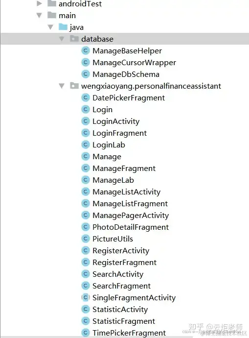 1:java文件夹里面包含的是后端的代码,其中包含了database和wengxiaoyang.personalfinanceassistant。其中包括的类如下图所示: