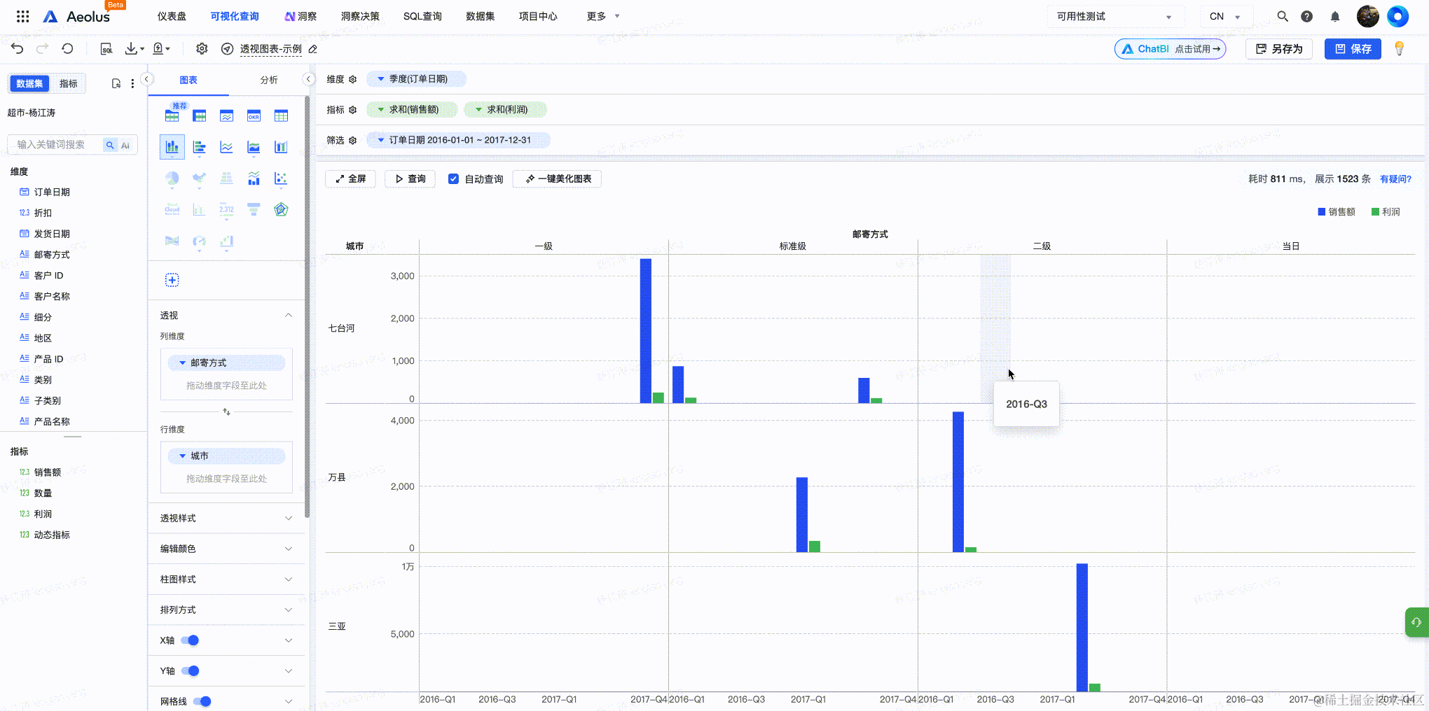 增加 1 个日期维度, 2 个指标, 并调整日期格式为“季度”