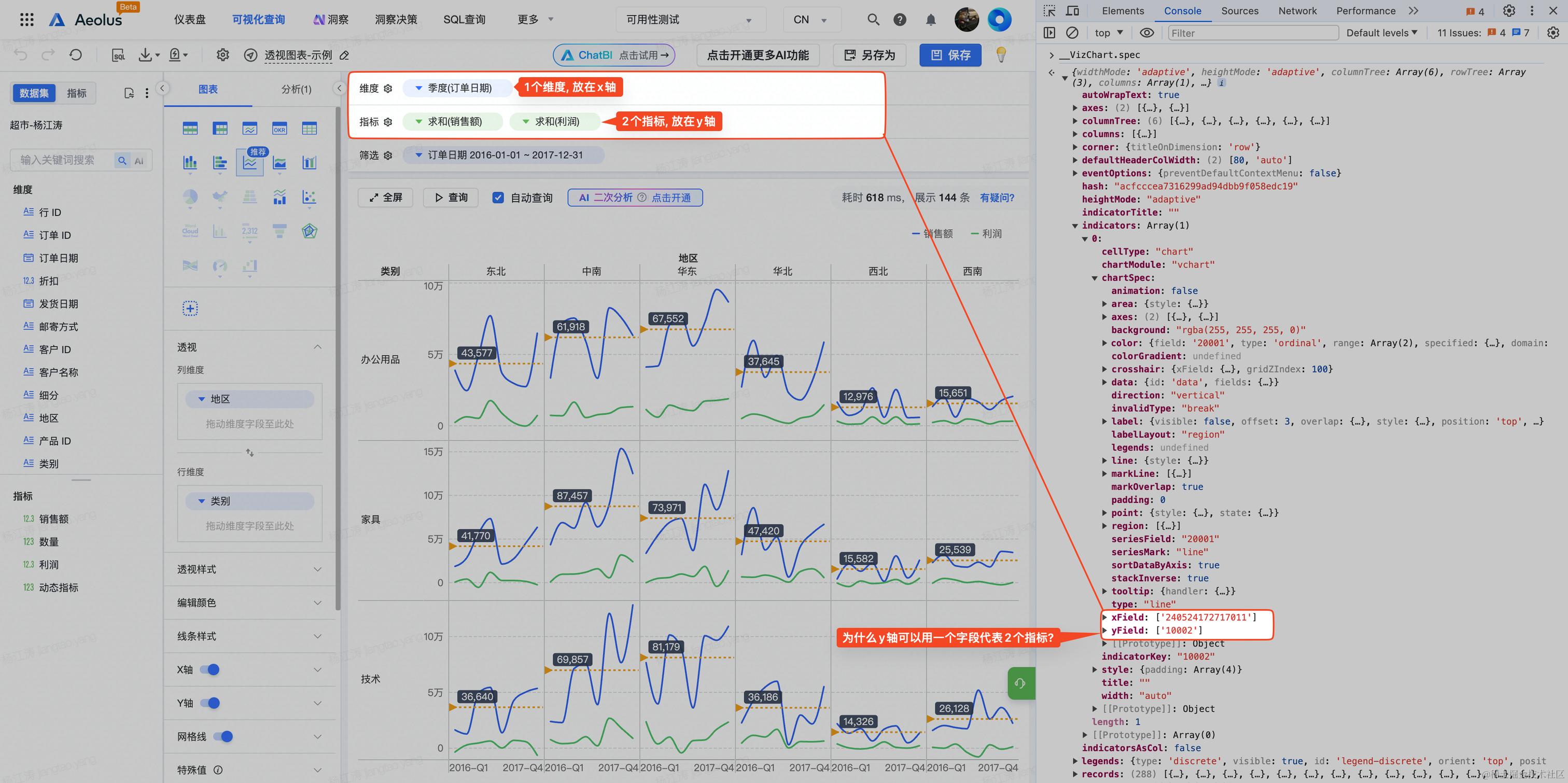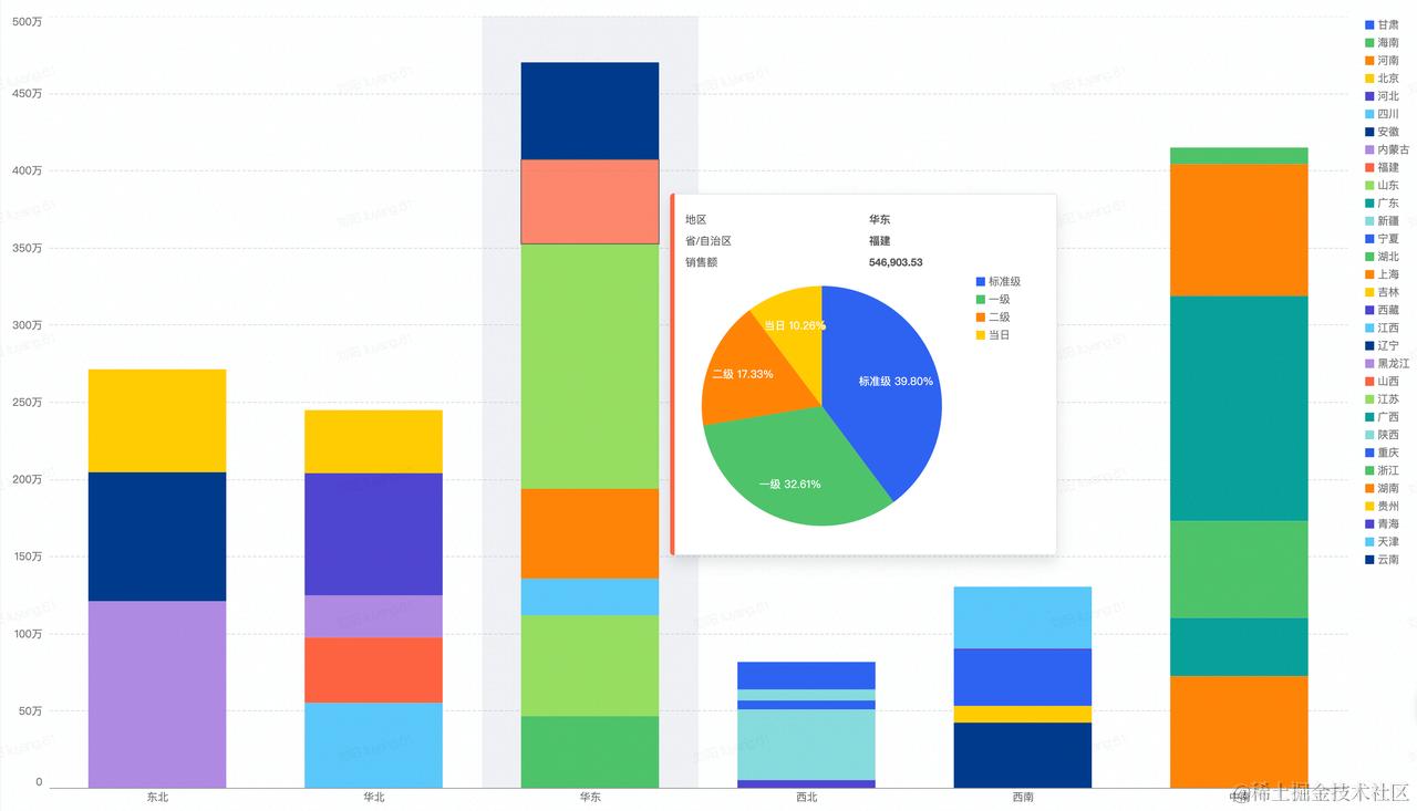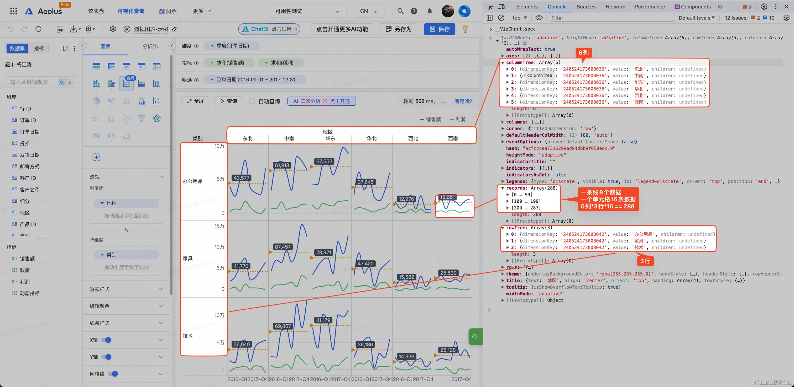 Spec 详细配置可以在 @VisActor/VChart 和 @VisActor/VTable 的站点查阅,这里我们简单介绍一下在BI 产品里颇具特色的透视组合图结构。