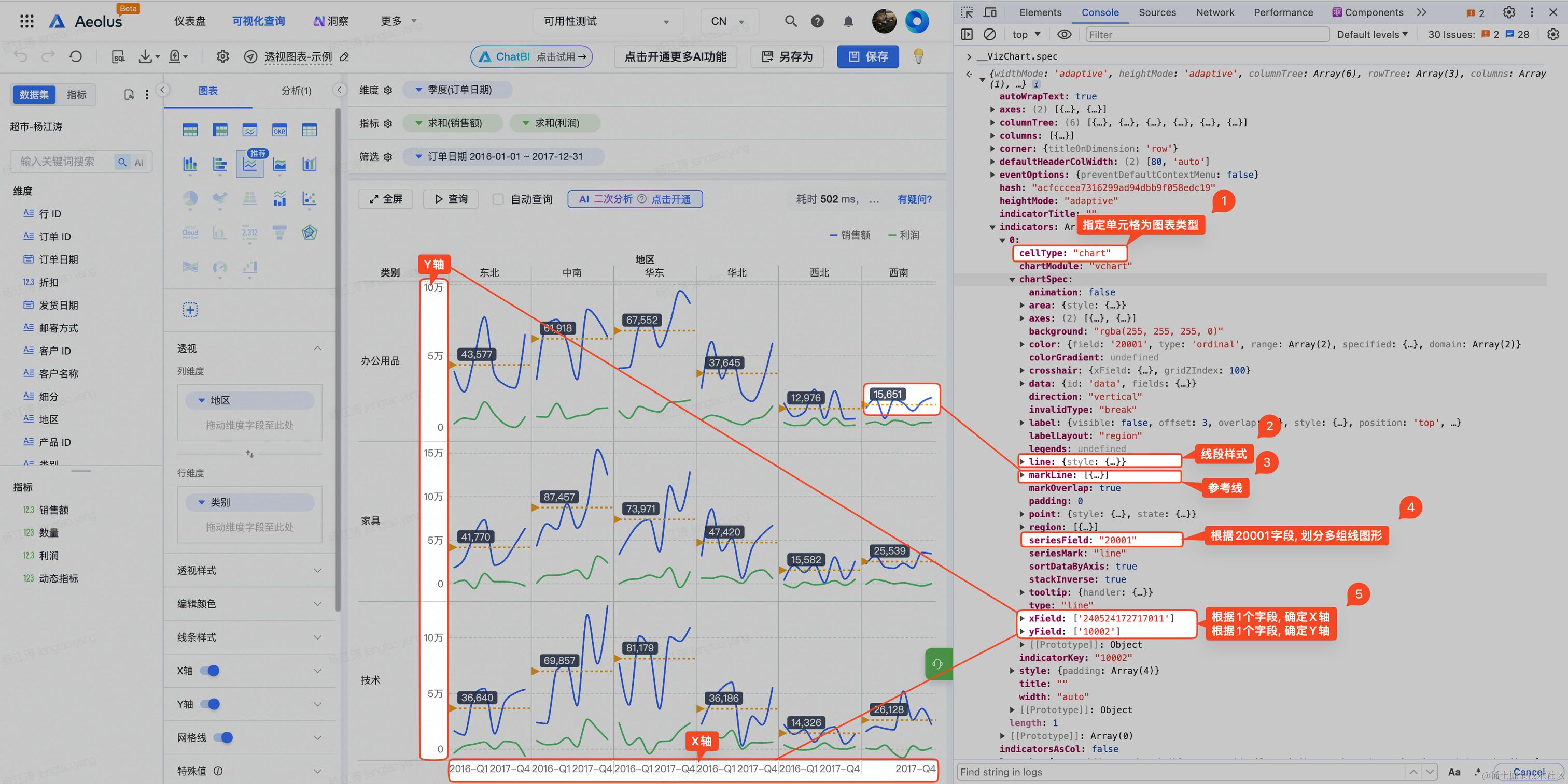 图表的 x、y 轴、坐标系、图例、标签、参考系, 都可以从图表的 spec 上看出。