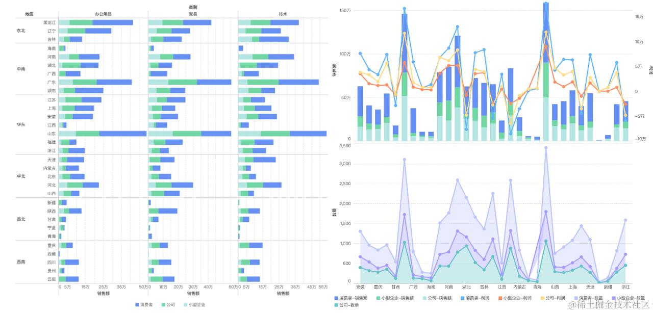 VizData 针对这种场景, 就需要对业务的图表切换能力进行抽象, 由此便基于图形语法设计 VizData, 可以让 VizData 脱离了具体的图表限制, 支持同一份数据渲染为多种图表。