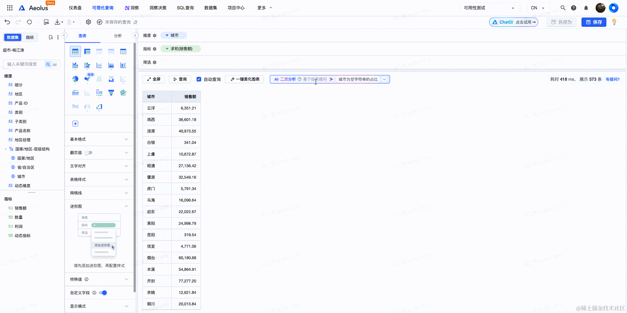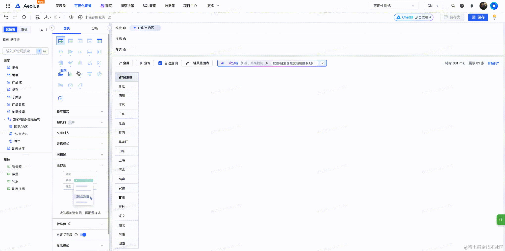 目前借助LLM实现的分析助手已经成为各种BI产品的标配, 它可以进行二次分析,帮助用户快速找到数据中的洞察。亦可根据用户当前选中的维度与指标,自动推荐相关的图表类型。 分析助手基于 @VisActor/VMind 实现。