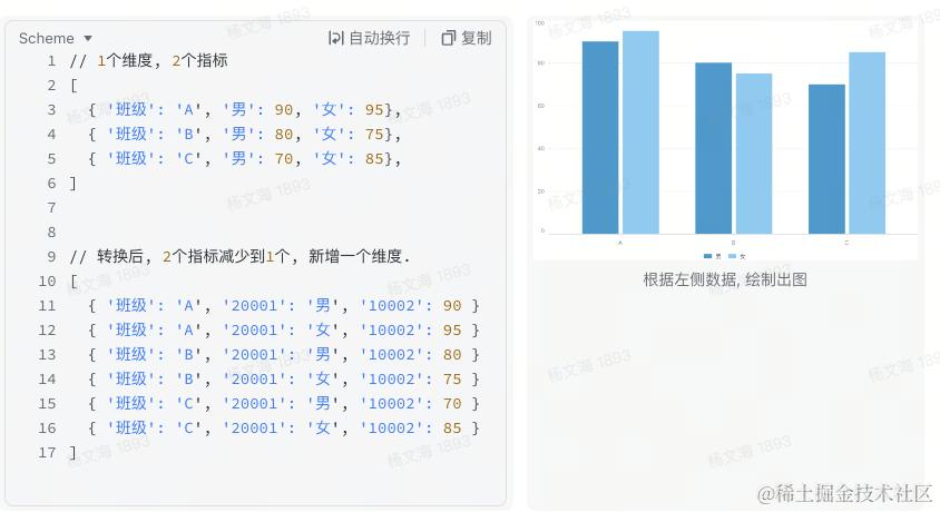 vizData 是用于统一描述图表、表格的数据结构, 是业务和图表库的桥梁。 我们从下面两个场景来说明 VizData 的作用。