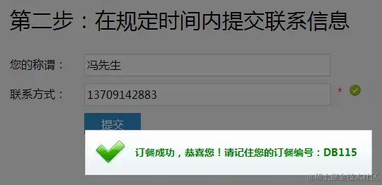 - 第二步,用户要在规定时间内填写其联系信息(称谓和联系方式,其中称谓选填),点提交,中转服务调用addContact为之前建立的临时记录补充客户联系信息,成功后返回用户编号(图5),用户在就餐时提供该编号,即可查询到预定的餐桌号(这是设想,本Demo暂时没添加就餐应用)。如因各种原因导致订餐失败(超时或者联系方式不正确),整个订餐过程都将停止,临时记录也会被删除,如图6和图7。