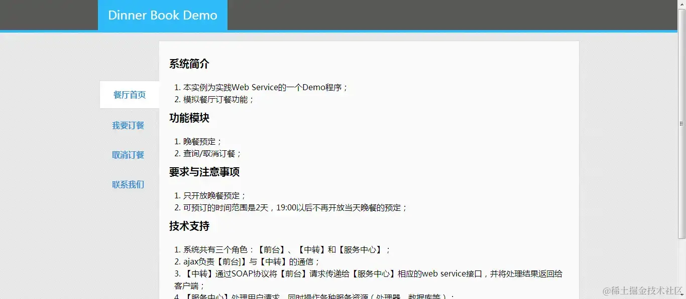 Demo的客户端采用网页的方式呈现,借用html/css/js技术进行设计,提供“订餐”和“取消订餐”等功能的前台操作界面。