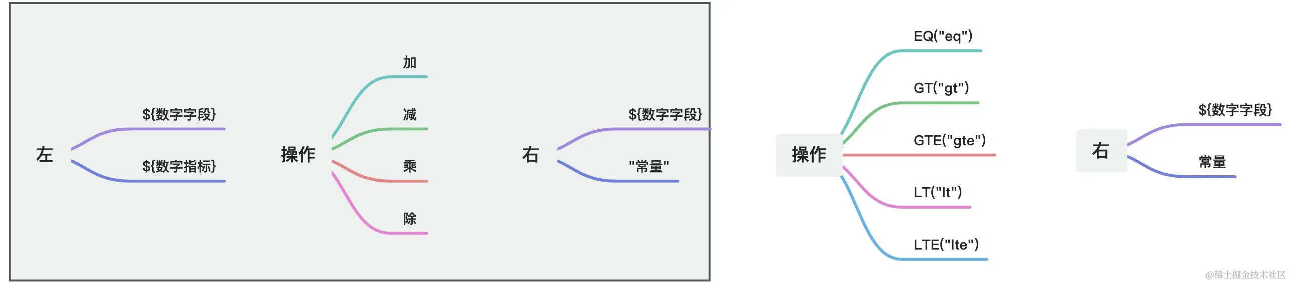 普通条件就可表示如下,因为左边,只有${字段}所以表设计的也简单,是field_name没有区分,而中间操作也只有这些,也是固定的operate_type,右边因为有变量${字段}和常量的区别,设计了expect_type和expect_value。