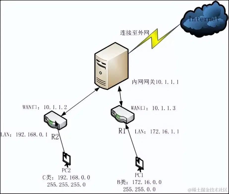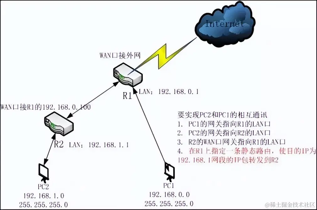 要想实现PC2和PC1之间的互相访问,看起来与情况1有些相似,需要在内网网关中添加两条静态路由。一般的小区网关肯定是不会随便让用户配置路由的,而且这样配置后,其他网段的电脑也可以访问PC1和PC2。
