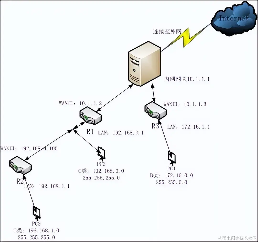 R1在R2与R3中间,R1本身连接pc2,那么要实现pc2与pc1、pc3互访,那么R1的目的地址就是pc1与pc3。