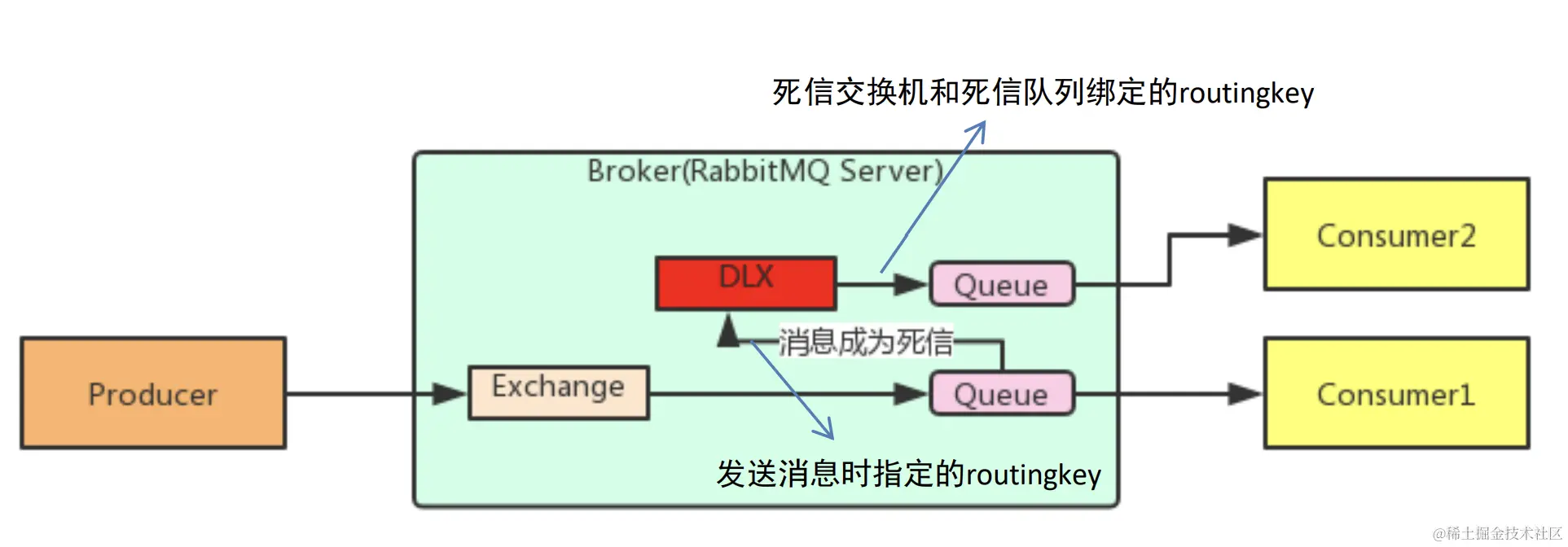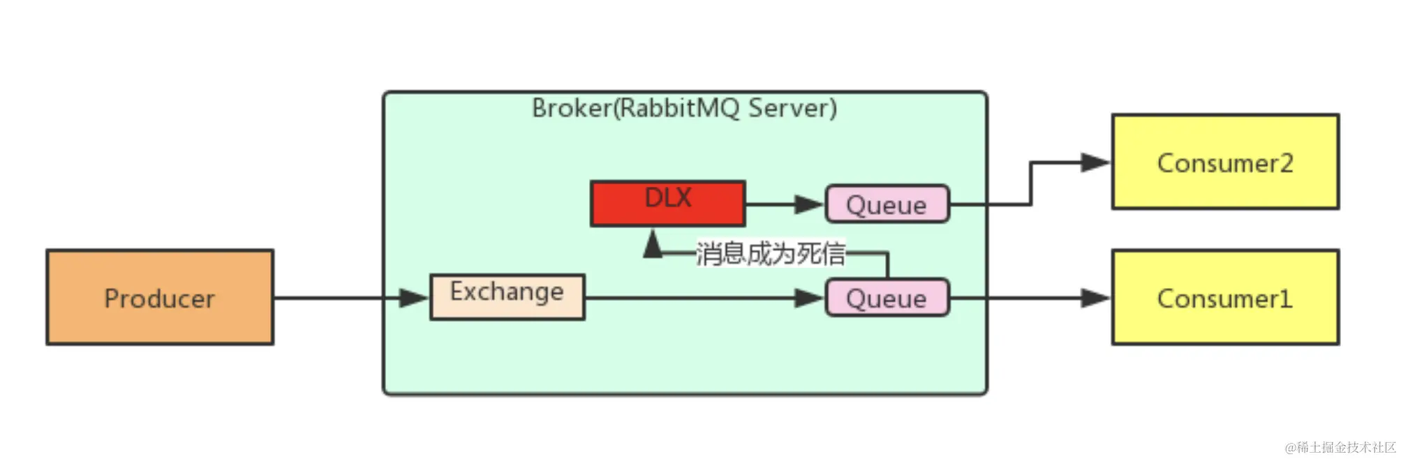 - 原队列存在消息过期设置,消息到达超时时间未被消费