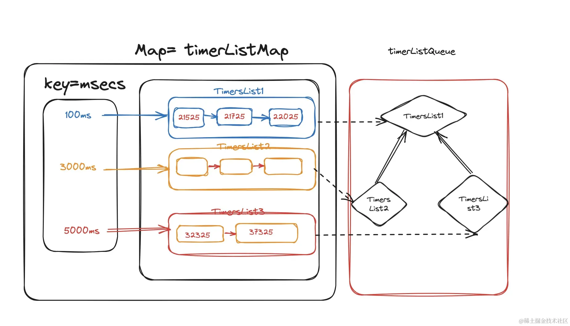 Map获取当前超时时间对应的链表,链表如果不存在,则计算过期时间点expiry并实例化一个新链表,这个过期时间就是这整条链表的最近超时时间了,然后新链表存入Map中,同时插入优先队列;最后判断是否需要启动定时器,通过scheduleTimer()启动定时器 -