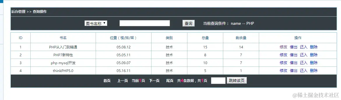 myExec($sql); if($row == 1) { echo ""; } ?>3.5借出,还入,删除图书模块