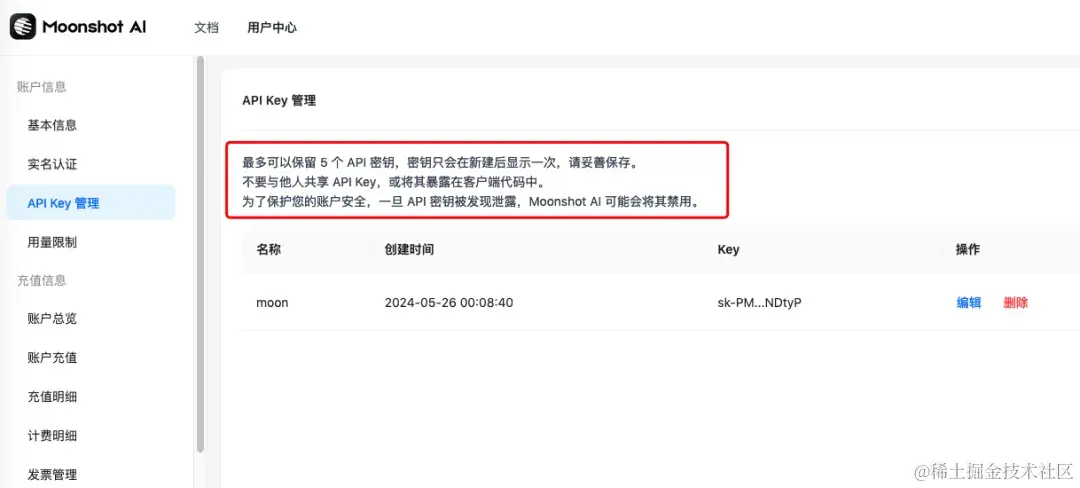 - 登录开发平台地址:platform.moonshot.cn/console/api…