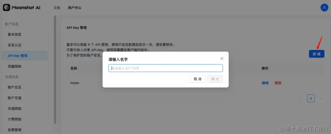 - 我们在 API Key 管理页面点击「新建」创建一个新的 API Key,在创建好之后会生成一个 key,大家要保存好它,因为只展现一次,如果没记住那就只能删除并重建了:
