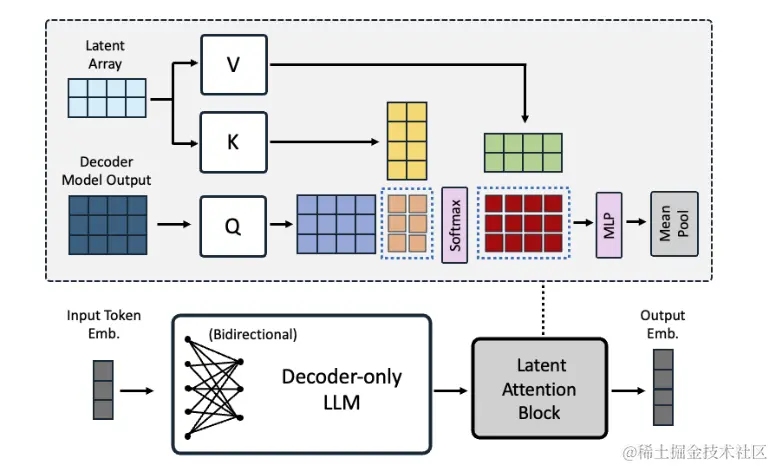 - 潜在注意力层: 为了更有效地对文本进行池化,获取更具表达力的文本表示,NV-Embed 引入了潜在注意力层。该层通过与可训练的潜在数组进行交叉注意力,对文本序列进行重新编码,并通过多层感知器 (MLP) 进一步优化表示。