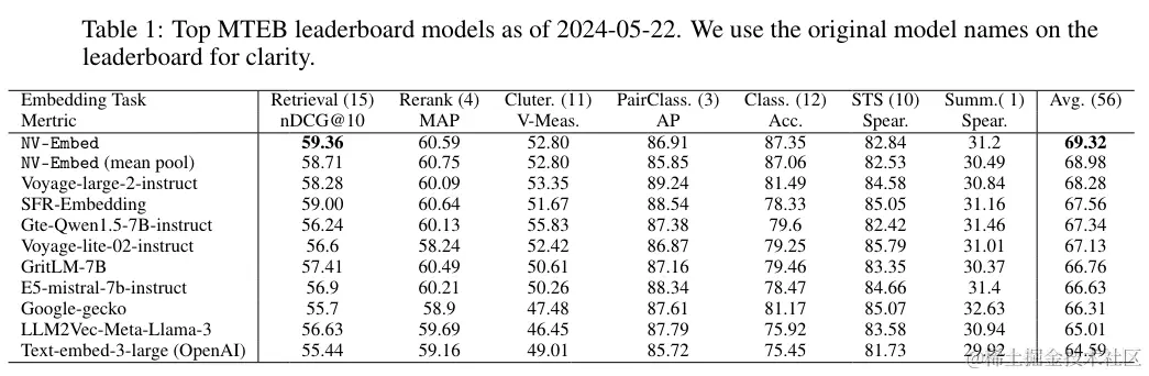 NV-Embed 模型在 MTEB (Massive Text Embedding Benchmark) 上取得了令人瞩目的成绩。该基准包含 56 项任务,涵盖了信息检索、重排序、分类、聚类和语义文本相似度等多种任务。NV-Embed 在这 56 项任务中获得了 69.32 的总分,排名第一,超越了包括 E5-mistral-7b-instruct、SFR-Embedding、Voyage-large-2-instruct 等在内的所有领先模型。值得注意的是,NV-Embed 在 BEIR (Benchmark for Information Retrieval) 基准测试 (包含 MTEB 中的 15 个检索任务) 上也获得了最高分 59.36。